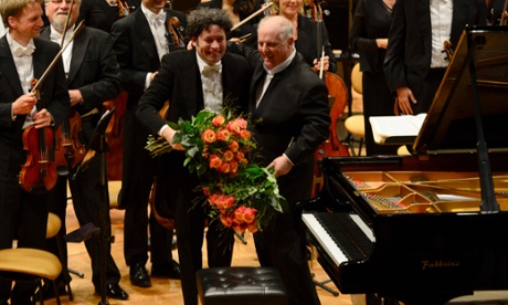 A massive exaggerated climax … conductor Gustavo Dudamel (left) takes applause with pianist Daniel Barenboim. Photograph: PR